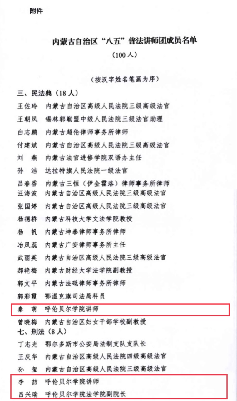 近日,内蒙古自治区委员会宣传部、内蒙古自治区司法厅下发关于成立内蒙古自治区“八五”普法讲师团的通知,bat365官网法学院副院长吕兴瑞、讲师秦萌、讲师李喆成功入选。