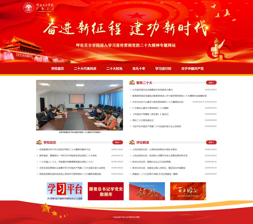 专题网站设置“聚焦二十大”“学校动态”“评论解读”“二十大代表风采”“二十大时光”“非凡十年”“学习进行时”“关于中国共产党”等八个栏目。专题网站上线,旨在为全校党员干部师生学习宣传贯彻党的二十大精神提供重要阵地,提供全面的学习辅导材料、生动的可视化学习资源、系统的专题评论解读。同时,通过专题网站及时发布学校学习宣传贯彻党的二十大精神的重要新闻,展示各部门开展的理论学习、宣讲教育、体会感悟、实践活动等各类工作动态,宣传展示学校学习宣传贯彻党的二十大精神的好做法和好经验。