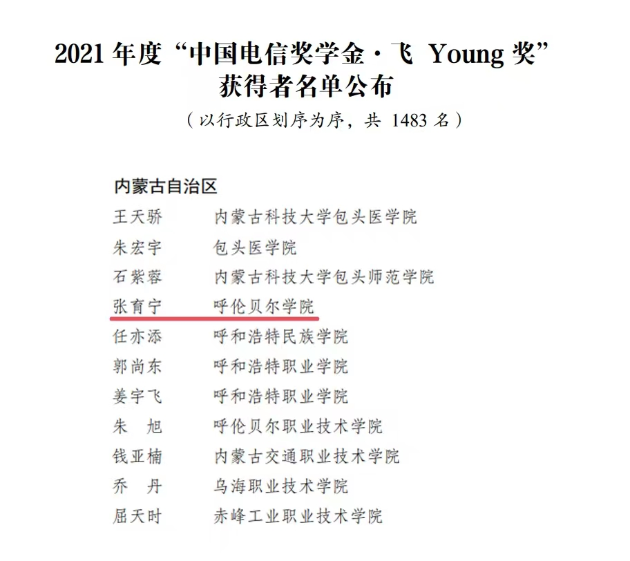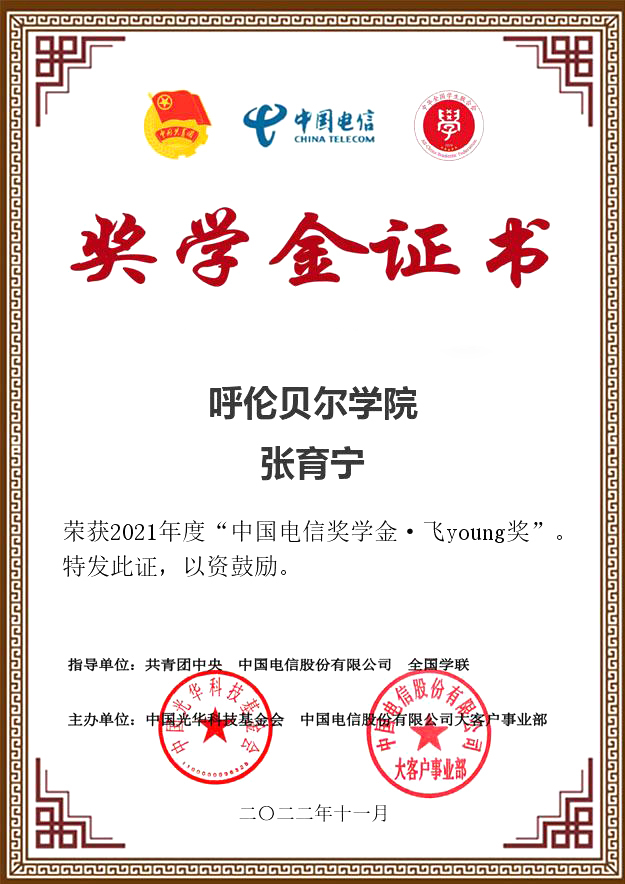 近日,由共青团中央、全国学联指导,中国电信集团有限公司、中国光华科技基金会联合举办的2021年度“中国电信奖学金”推报活动遴选结果公布,bat365官网旅游与地理学院学生张育宁荣获“中国电信奖学金•飞Young奖”。