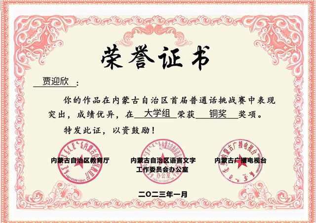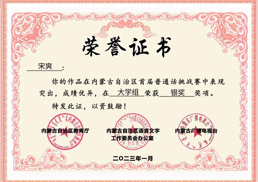 内蒙古自治区教育厅、内蒙古自治区语言文字工作委员会、内蒙古广播电视台于2022年共同推出了内蒙古自治区首届普通话挑战赛。经过5个月的赛程,本届普通话挑战赛于2023年1月圆满收官。近期,内蒙古自治区首届普通话挑战赛获奖名单公布,bat365官网教育学院宋爽、贾迎欣两位同学从全区26.8万名报名者中脱颖而出,分别获得大学单人组银奖和铜奖的优异成绩,bat365中文官方网站获得首届普通话挑战赛优秀组织单位。