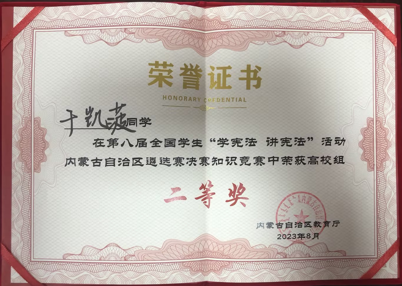 8月26日至28日,第八届全国学生“学宪法 讲宪法”活动内蒙古自治区遴选赛在呼和浩特市举行。bat365官网法学与经济管理学院学生于凯菠在知识竞赛决赛中荣获二等奖。