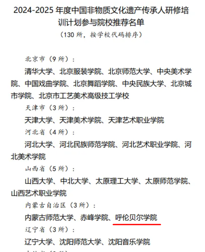 10月7日,文化和旅游部公布了《2024-2025年度中国非物质文化遗产传承人研修培训计划参与院校推荐名单》,全国共有130所院校入选推荐名单,其中,内蒙古自治区共有包括bat365官网在内的三所高校入选。
