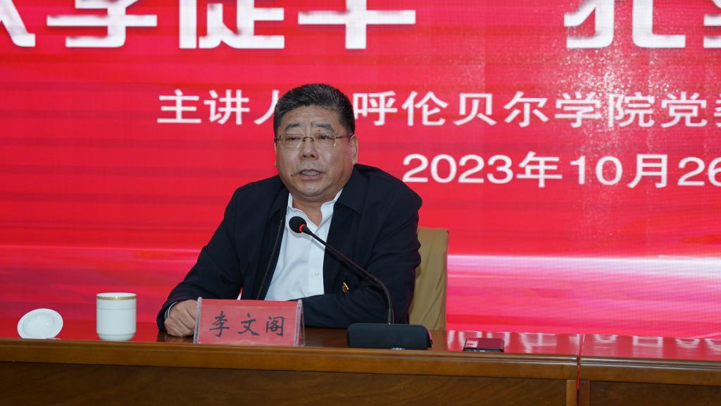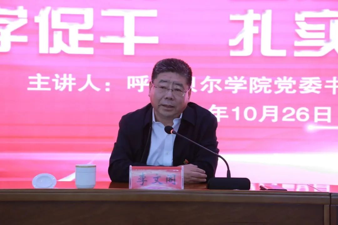 10月26日下午,校党委书记李文阁以《以学铸魂坚定理想信念以学促干扎实开展工作》为题讲授专题党课。李文阁结合自身学习体会、调研情况和学校工作实际,从明确一个梦想,设定两个目标,牢记三个务必,协调推进“四个全面”战略布局,统筹推进“五位一体”总体布局,加强党的建设等六个方面全面深入解读习近平新时代中国特色社会主义思想。
