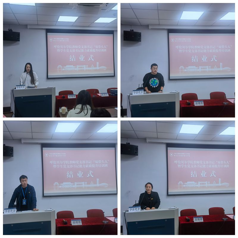 结班仪式上,学员代表王金玲、钟清涛、孟庆永和杨娜汇报了学习心得。他们表示培训课程既有理论高度和思想深度,又有实践厚度和情感温度,主题鲜明、重点突出,提供了充沛的“精神养分”,大家感觉受益匪浅、收获颇丰。决心在今后的支部工作中要加快探索党建工作与业务工作融合的新路径新方法,搭建党建综合服务平台载体,为师生办好事办实事,充分发挥党支部战斗堡垒作用。