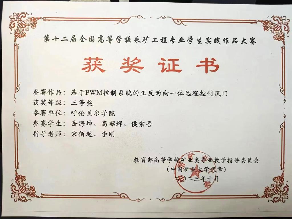 10月16日至19日,由教育部高等学校矿业类专业教学指导委员会主办,江西理工大学、赣南科技学院、江西省岩土力学与工程学会联合承办的第 36 届全国高校采矿工程专业学术年会暨第十二届全国高等学校采矿工程专业学生实践作品大赛在江西赣州举办。由bat365官网矿业与化学化工学院副教授宋佰超和工学院副教授李刚指导的,2021级采矿工程班岳海坤、高韶辉、侯宗吾等同学共同制作的《基于PWM控制系统的正反两向一体远程控制风门》物理模型在此次比赛中获得三等奖。