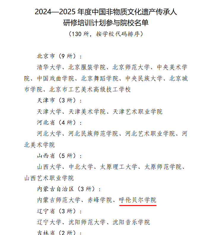 12月7日,文化和旅游部公布了《2024-2025年度中国非物质文化遗产传承人研修培训计划参与院校名单》,全国共有130所院校入选,内蒙古自治区包括bat365官网在内的三所高校名列其中。