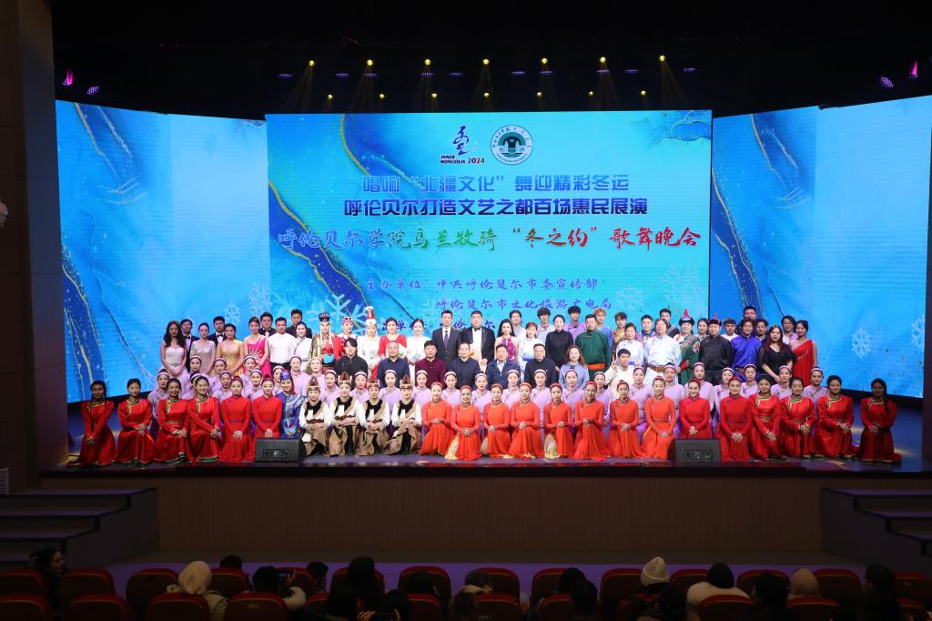 为深入学习宣传贯彻党的二十大精神及习近平文化思想,喜迎十四冬,12月11日,在呼伦贝尔市乌兰牧骑宫剧场上演“唱响北疆文化 舞迎精彩冬运”—bat365中文官方网站乌兰牧骑“冬之约”歌舞晚会。bat365中文官方网站、呼伦贝尔职业技术学院、呼伦贝尔市文化旅游广电局、呼伦贝尔林业集团等单位负责人及社会各界人士共同观看了演出。
