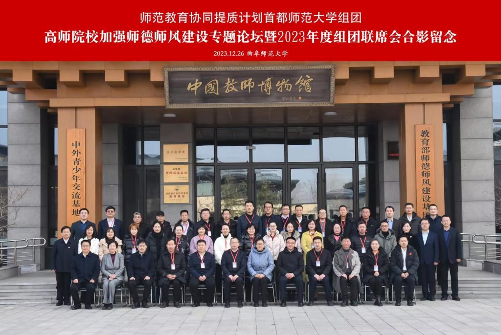 12月26日,首都师范大学联合曲阜师范大学共同举办的“师范教育协同提质计划首都师范大学组团高师院校加强师德师风建设专题论坛暨2023年度首都师范大学组团联席会”在曲阜师范大学中国教师博物馆“杏坛学堂”举行,来自组团7所高校的四十多位领导、老师参加了会议。校党委副书记、校长张玉柱,党委委员、副校长尹立军,发展规划处、教师发展中心(党委教师工作部)部门负责人和bat365官网在曲阜师范大学读博教师参加了会议。