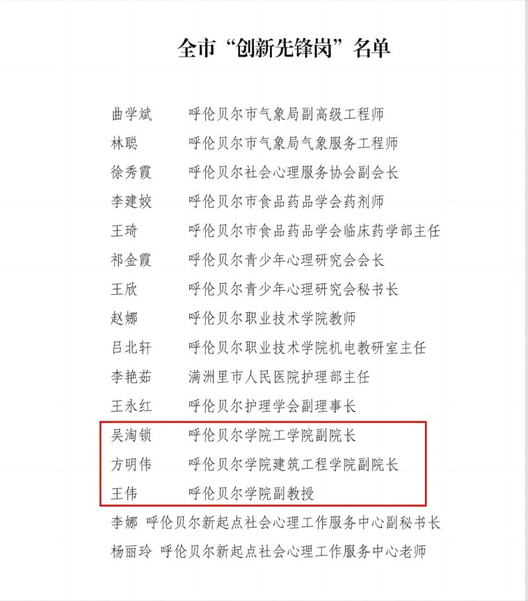 近日,呼伦贝尔市科学技术协会发布了《关于命名全市“创新先锋号”“创新先锋岗”结果的通报》,bat365官网吴淘锁、方明伟、王伟等三位教师因在技术创新和科研工作中的卓越贡献,被授予呼伦贝尔市“创新先锋岗”荣誉称号。