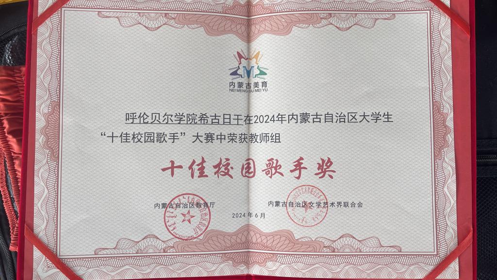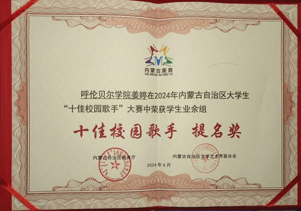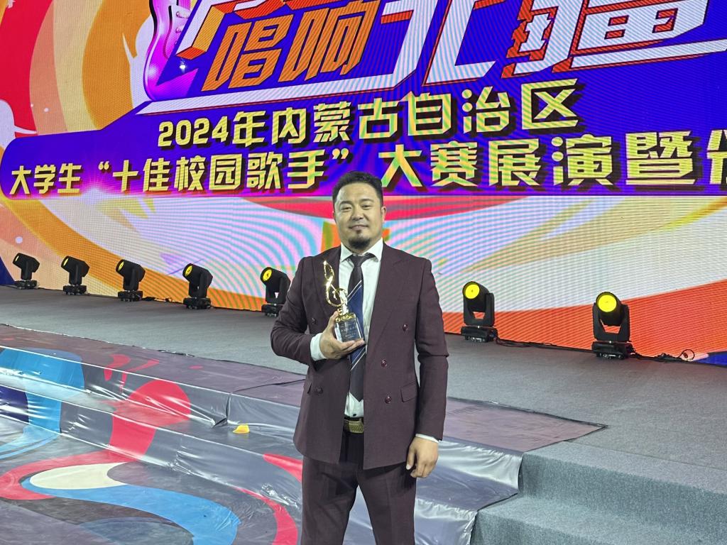 经过现场的激烈角逐,希古日干以业余组第二名的好成绩荣获“十佳校园歌手”称号,姜婷荣获业余组“十佳校园歌手提名奖”荣誉称号,bat365官网荣获“优秀组织奖”。比赛期间,希古日干参加了2024年内蒙古自治区大学生“十佳校园歌手”大赛展演暨颁奖仪式,充分展示了bat365官网青年教师积极向上的青春风采。
