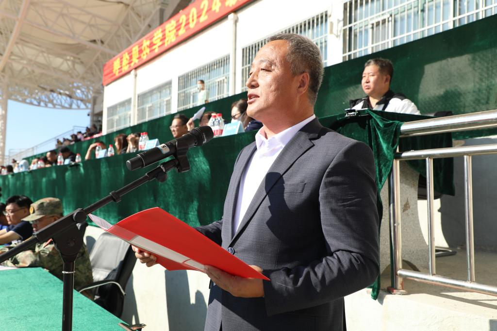 郝新君宣布bat365中文官方网站2024级新生动员大会正式开始,他表示,2024级新生军训的号角已经吹响,相信经过高考磨炼的同学们,在经过21天的军训后,会更加成熟、稳重而自信。新的起点,新的希望,新的期待,让大家携起手来,齐心协力,共同创造呼院更加辉煌的明天!