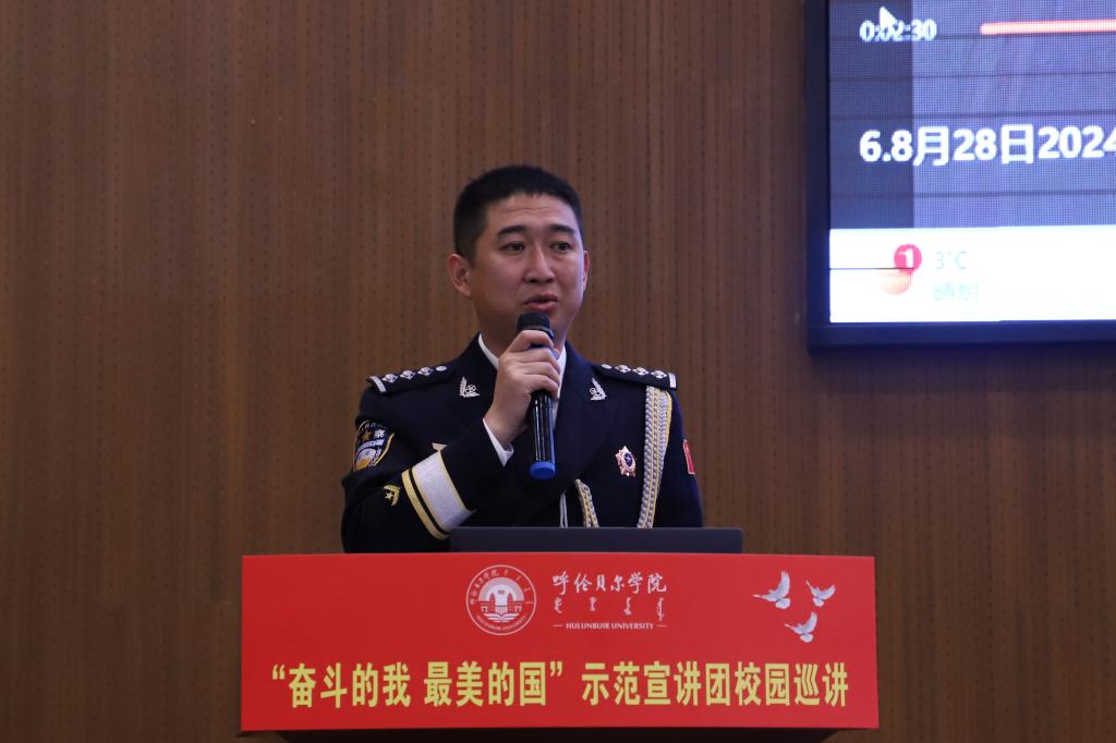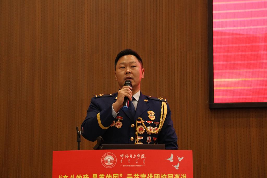 自治区北疆楷模、内蒙古出入境边防检查总站阿拉善边境管理支队银根边境派出所副所长徐乃超以《在大漠戈壁书写最美青春》为题,讲述了自己从警16年来,扎根在祖国北疆,携手妻子李文娜投身戍边事业的动人故事。希望同学们树立高远志向,历练敢于担当、不懈奋斗的精神,刚健有为、自强不息。