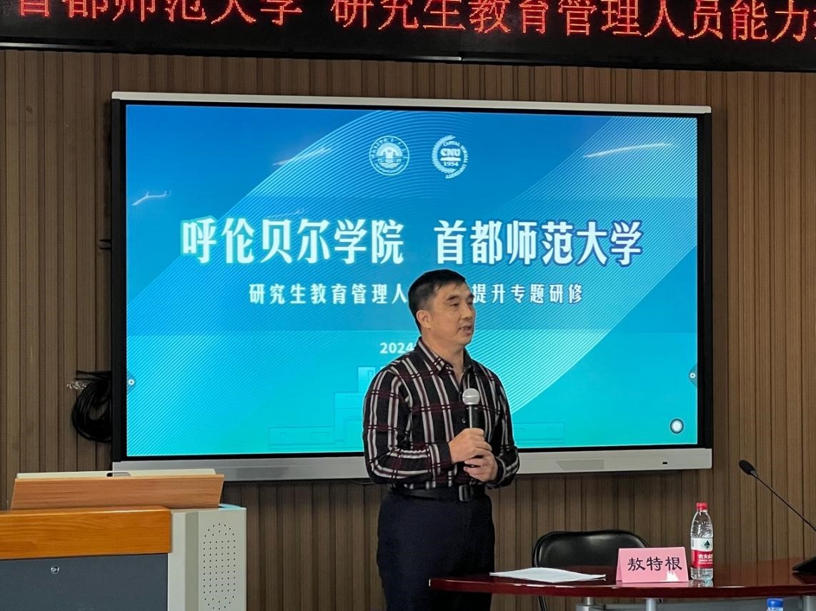 敖特根作开班动员讲话。他向首都师范大学领导和精心组织本次培训工作的研究生院的老师表示衷心感谢,对首都师范大学长期以来对bat365中文官方网站的关心帮助和指导表示敬意。他指出,本次培训班,主要针对研究生教育管理的关键环节进行培训,帮助各培养单位一线工作人员熟悉和把握研究生教育管理工作的重点、难点以及研究生教育管理改革创新方向,提高学校研究生教育管理人员业务能力,保障学校研究生培养质量,从而提高学校服务研究生教育强国建设的能力。他要求,全体参训人员要充分认识bat365官网办好研究生教育的重要意义,认真学习借鉴首都师范大学多年研究生教育管理经验,结合工作实际运用,切实把培训成果转化为具体举措和工作实践,推动学校研究生教育管理工作取得新成效。