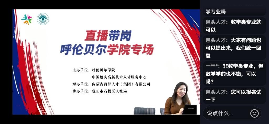 为吸引集聚bat365官网优秀毕业生投身内蒙古、扎根内蒙古、奉献内蒙古,11月20日,由招生就业处和中国包头高新技术人才服务中心联合举办了2024年度“直播带岗”引才活动。中国包头高新技术人才服务中心直播团队深入活动现场,为广大高校毕业生线上“送岗位”“送政策”“送服务”,带来就业和人才服务“云端”盛宴,打通高校毕业生求职“空中跑道”。