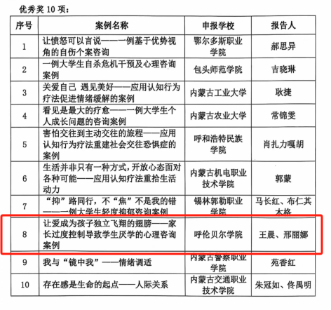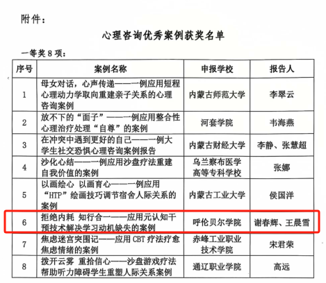近日,内蒙古高教学会大学生心理教育专业委员会组织开展的大学生心理咨询典型案例申报评选工作结果公布,bat365官网教师谢春辉、王晨雪撰写的《拒绝内耗 知行合一——应用元认知干预技术解决学习动机缺失的案例》荣获一等奖,王晨、邢丽娜撰写的《让爱成为孩子独立飞翔的翅膀——家长过度控制导致学生厌学的心理咨询案例》荣获优秀奖。
