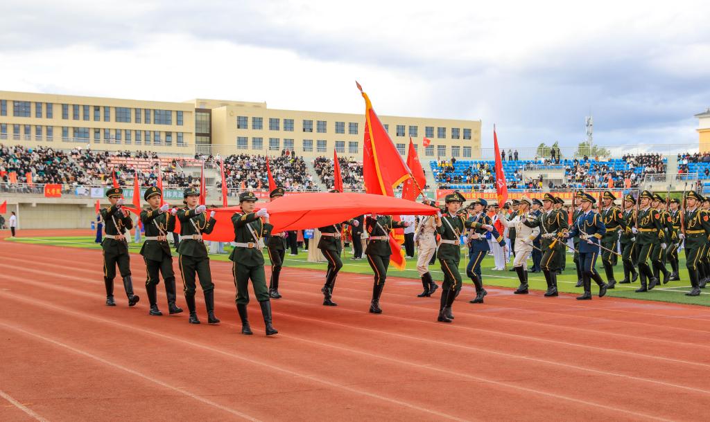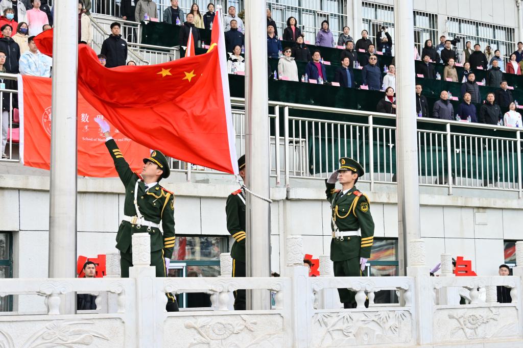 英姿飒爽的国旗护卫队护送鲜艳的五星红旗缓缓走来,步伐铿锵有力。全体师生庄严肃立,向国旗行注目礼,在雄壮的国歌声中,鲜艳的五星红旗冉冉升起,全场师生齐唱国歌。这一刻,爱国之情在每个人心中激荡,让青春与家国情怀紧紧相连。