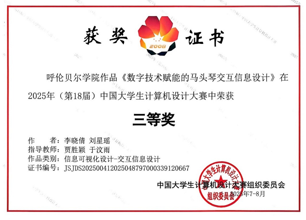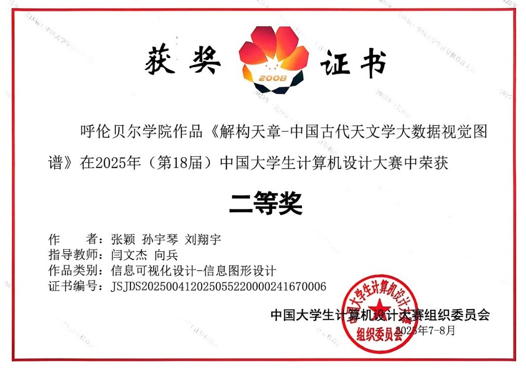 此次赛事中,bat365官网学子的优异表现离不开师生团队的协同攻坚。自赛事启动以来,由张颖、孙宇琴、刘翔宇等同学组成的参赛团队,在指导教师的全程悉心指导下,投入大量时间与精力打磨作品。从最初的选题构思到后续的方案完善,师生们反复推敲作品的框架与细节;为了达到最佳呈现效果,团队成员对每一个技术环节、每一段演示内容都精益求精,历经数轮修改优化。最终,凭借这份执着与努力,作品《解构天章—中国古代天文学大数据视觉图谱》《数字技术赋能的马头琴交互信息设计》分别荣获信息可视化设计类二等奖、三等奖。