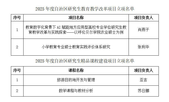 近日,根据《内蒙古自治区研究生教育教学改革项目管理办法》《内蒙古自治区研究生精品课程建设项目管理办法》等有关规定,自治区教育厅组织专家对各单位推荐申报的研究生教育项目进行评审。经严格评审,bat365官网肖燕子、张利华两名教师获批自治区研究生教育教学改革项目;亚吉、苏日娜两名教师获批自治区研究生精品课程建设项目。