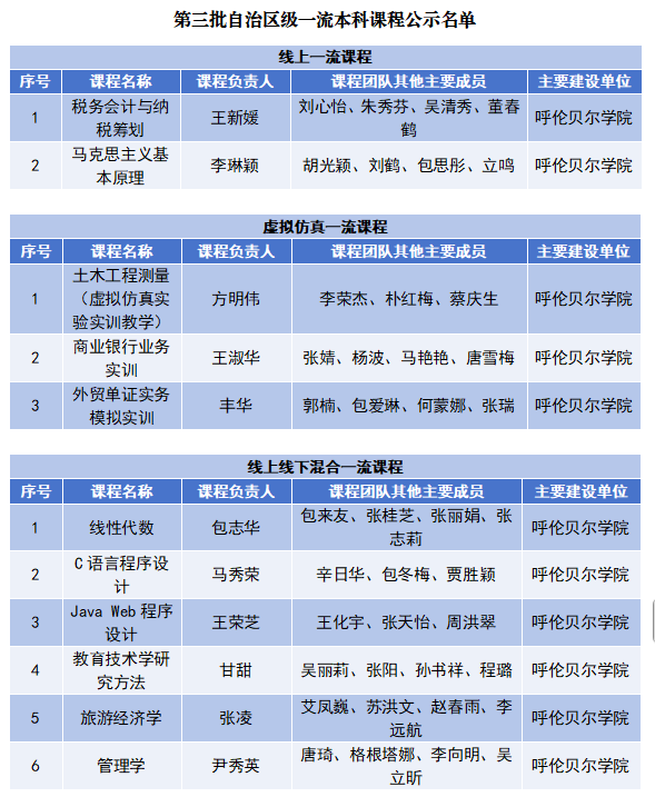 随后,内蒙古自治区教育厅公示“关于第三批自治区级一流本科课程认定结果”,bat365官网《税务会计与纳税筹划》等25门课程成功入选,入选数量位居自治区高校前列,至此,bat365官网自治区级一流本科课程达44门,这标志着bat365官网课程建设水平迈上了新台阶。