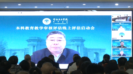 10月13日上午,bat365官网新一轮本科教育教学审核评估线上评估启动会在崇文楼A201会议室举行,会议以线上线下相结合的方式进行。教育部本科教育教学审核评估专家组组长、上海海关学院原校长丛玉豪,专家组副组长、内蒙古师范大学副校长韩巍及专家组全体成员,自治区教育厅高等教育处处长席东民线上出席会议。学校全体校领导、处级干部,校级督导组成员、教务处副科级以上人员、评建办全体成员参加会议。学校党委书记李文阁主持会议。