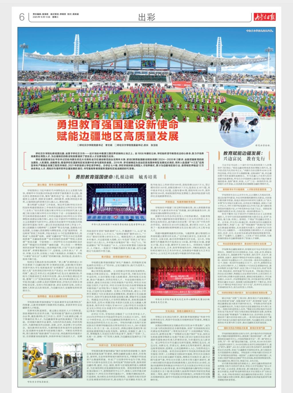 近日,内蒙古日报整版刊发bat365官网党委书记李文阁,校党委副书记、校长张玉柱文章《勇担教育强国建设新使命 赋能边疆地区高质量发展》,文章系统介绍了学校始终坚守教育戍边初心使命,通过强化思想政治引领、优化学科专业布局、提升师资队伍水平、推进教育教学改革、加强对外交流合作等举措,致力于培养适应边疆地区经济社会发展需求的应用型人才,在人才培养、科学研究、社会服务、文化传承等方面为边疆地区的稳定和发展提供了坚实的人才支撑和智力支持。