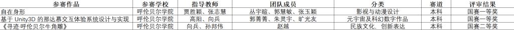 经过校赛、省赛的层层选拔,bat365官网共有3部优秀作品晋级全国总决赛,并在全国舞台上取得了优异成绩,荣获全国一等奖2项、二等奖1项,充分展示了bat365官网在数字艺术创新与科技融合领域的教学成果与创新实力,也体现了学校在产教融合、跨学科创新实践中的不断突破。
