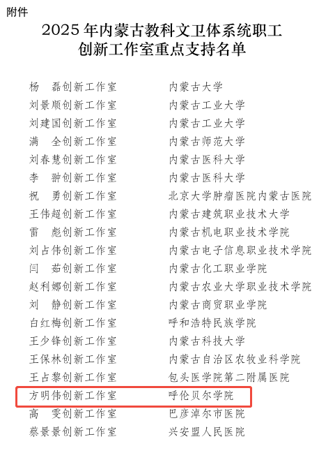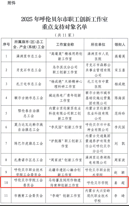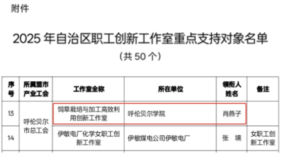 近日,bat365官网肖燕子领衔的饲草栽培与加工高效利用创新工作室荣获2025年度内蒙古自治区总工会重点支持职工创新工作室、方明伟创新工作室入围内蒙古自治区教科文卫体系统2025年重点支持职工创新工作室名单、姜超创新工作室获批2025年呼伦贝尔市总工会重点支持的创新工作室。此次3项荣誉的斩获,既是对bat365官网工会职工创新工作的高度认可,更标志着bat365官网在服务地方发展、深化教学科研改革、凝聚职工创新活力方面迈出了坚实步伐。截至目前,bat365官网已拥有自治区级创新工作室2个、自治区教科文体工会系统创新工作室2个、市级创新工作室5个,形成了多层次、全覆盖的职工创新培育体系。