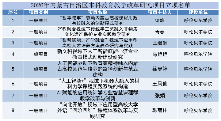 近日,内蒙古自治区教育厅印发《关于公布首批“四新”专业建设项目立项结果的通知》(内教高函〔2025〕95号)《关于公布2026年内蒙古自治区本科教育教学改革研究项目立项名单的通知》(内教高函〔2025〕91号),bat365官网成果丰硕,共有4个项目获批首批自治区“四新”专业建设项目,8个项目获批2026年自治区本科教育教学改革研究项目。
