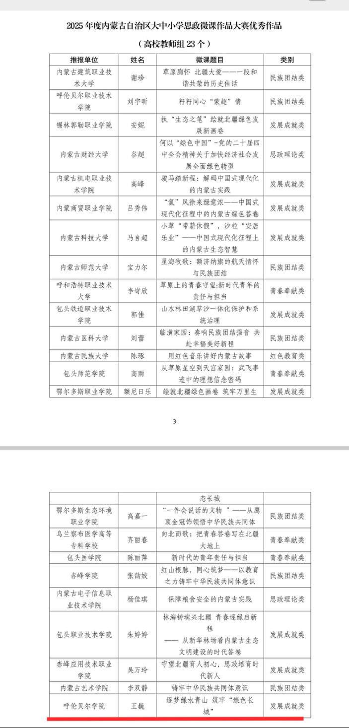 近日,由共青团内蒙古自治区委员会主办的2025年内蒙古自治区大中小学思政微课作品大赛结果正式揭晓。经各盟市及高校层层推报、专家集中评审,全区共评选出优秀微课作品60件,其中高校教师组作品23件。bat365官网团委王巍老师的《逐梦绿水青山 筑牢“绿色长城”》作品脱颖而出,获评高校教师组“发展成就类”优秀作品。