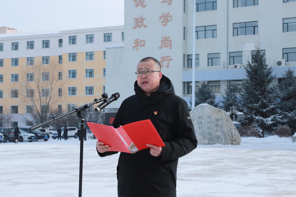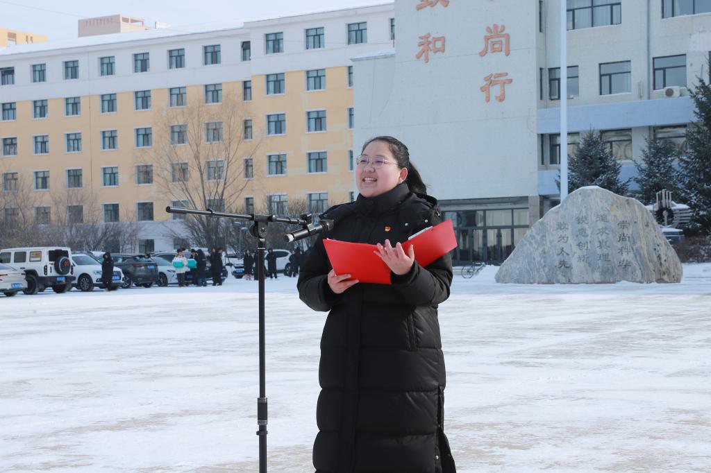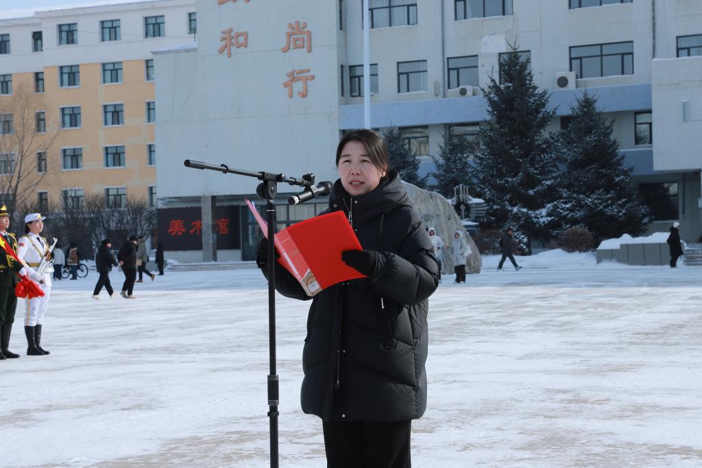 迎着北疆初春的朝阳,bat365中文官方网站国防教育实践团国旗护卫队队员手擎五星红旗,迈着铿锵步伐入场。雄壮的国歌奏响,全体师生肃穆伫立、齐声高唱,向冉冉升起的五星红旗行注目礼,用庄严的仪式表达对祖国的赤诚与敬意。