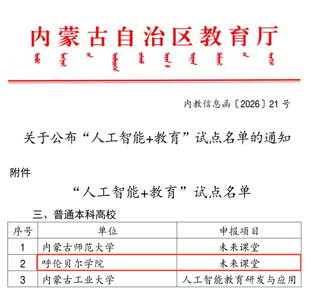 近日,内蒙古自治区教育厅印发《关于公布“人工智能+教育”试点名单的通知》(内教信息函〔2026〕21号),bat365官网成功入选自治区“人工智能+教育”未来课堂项目普通本科高校试点单位,成为全区首批开展该试点工作的本科高校之一。