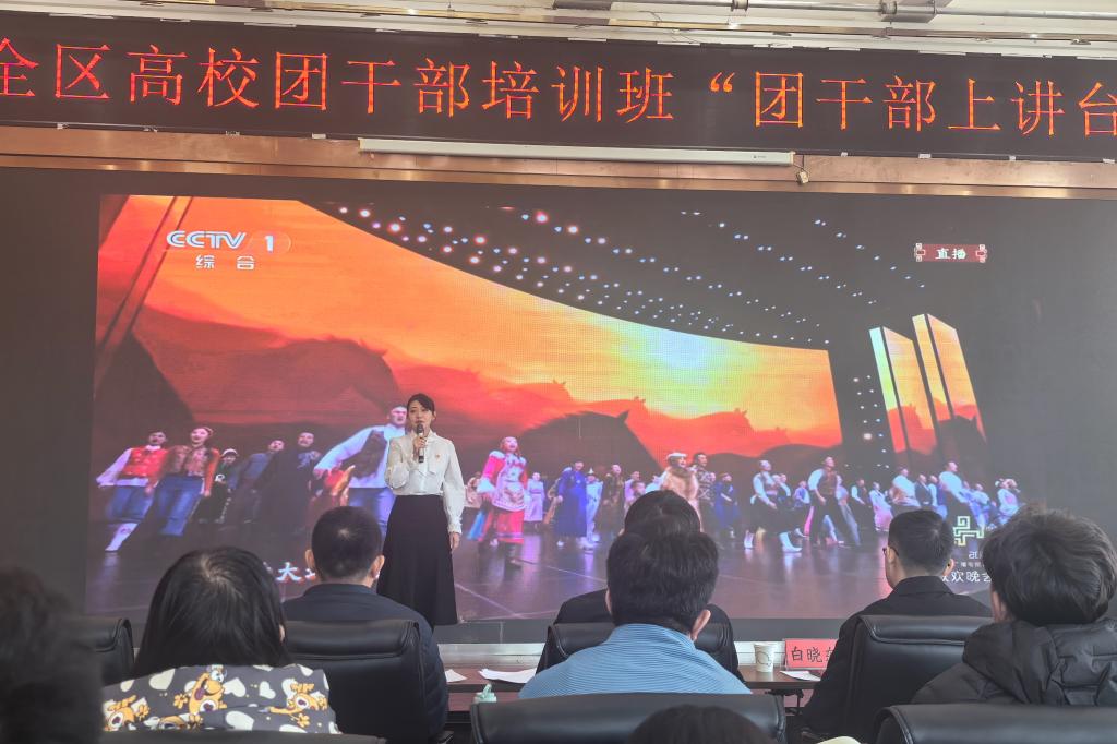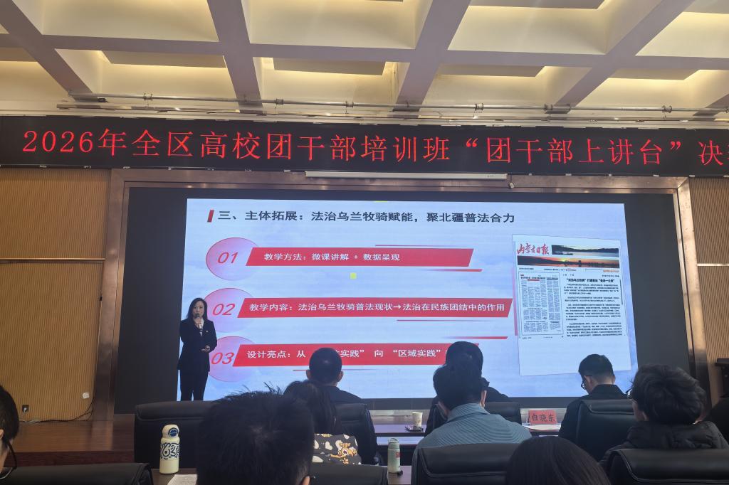 历经初赛的激烈角逐,两位老师在来自全区40所高校的优秀选手中脱颖而出进入决赛。决赛现场,王艺淳以2026年央视春晚节目《奔腾的海骝马》为切入点,运用案例生动阐释了“吃苦耐劳、一往无前,不达目的决不罢休”的蒙古马精神,结合铸牢中华民族共同体意识,用青春视角和鲜活语言阐释党的创新理论。赵婷依托自身带领青年志愿者深入牧区开展普法实践的实际经历,通过情景导入、实践讲述、主体拓展、使命号召等环节进行团课设计,号召青年学生做习近平法治思想的“信仰者”和民族团结的“践行者”。