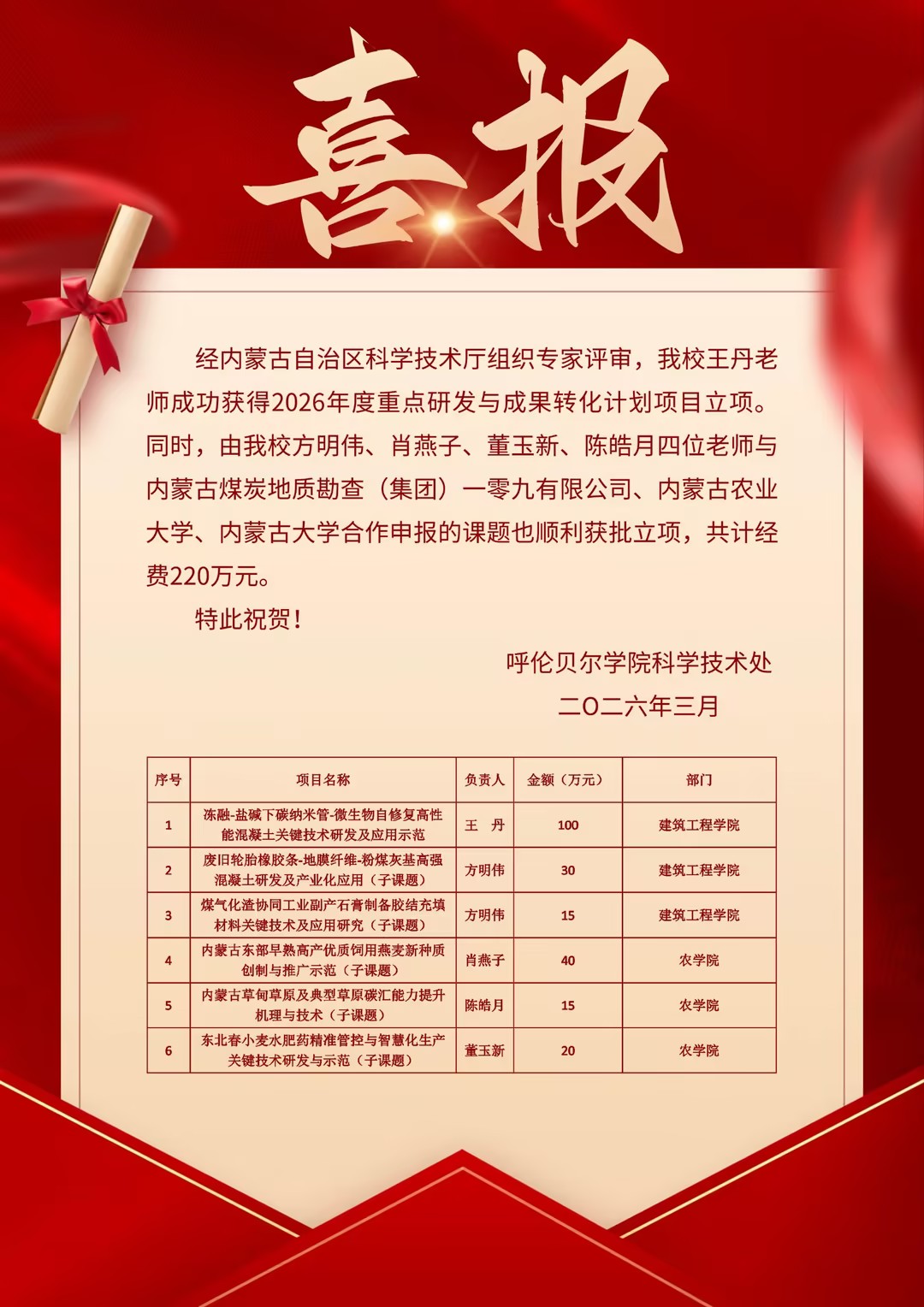 近日,经内蒙古自治区科学技术厅组织专家评审,bat365官网建筑工程学院教师王丹主持的《冻融-盐碱环境下碳纳米管-微生物自修复高性能混凝土关键技术研发及应用示范》项目,成功获批2026年度自治区重点研发与成果转化计划立项,获100万元资助。同时,bat365官网建筑工程学院方明伟牵头的两项子课题和农学院肖燕子、董玉新、陈皓月等四位老师联合内蒙古煤炭地质勘查(集团)一零九有限公司、内蒙古农业大学、内蒙古大学共同申报的5项课题,均顺利获批立项,累计获得经费220万元,彰显了学校在科研创新与成果转化方面的强劲实力。