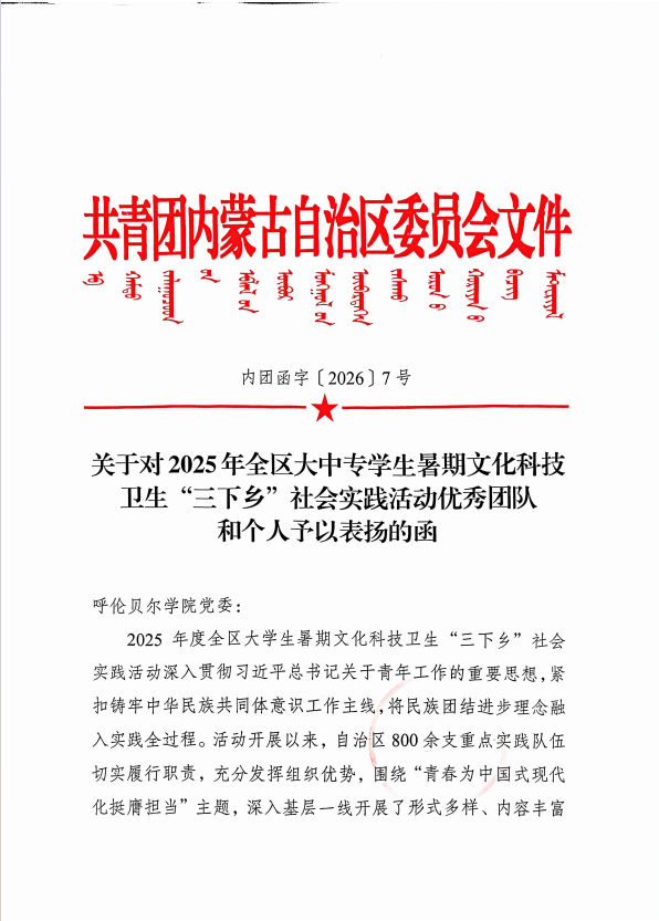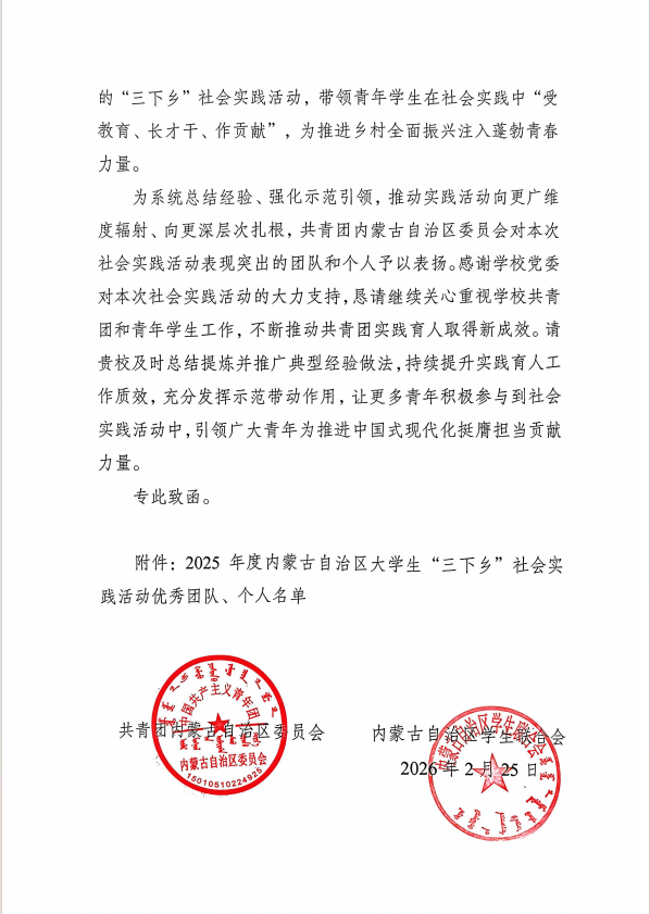 近日,共青团内蒙古自治区委员会、内蒙古自治区学生联合会致专函表扬bat365官网在2025年度全区大学生暑期科技文化卫生“三下乡”社会实践活动中表现优秀的团队和个人。