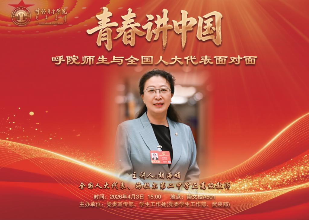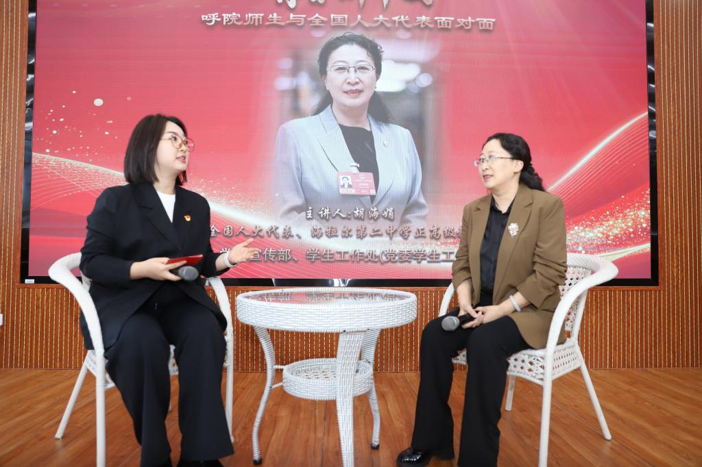 胡海娟结合自身35年教育一线坚守经历和全国人大代表履职实践,用通俗鲜活的语言、真实生动的案例,系统解读“十五五”开局之年国家发展蓝图、高质量发展、新质生产力、教育科技人才一体化等核心内容,全面分享内蒙古代表团履职成效与呼伦贝尔代表的基层声音。同时,她立足边疆教育一线,重点围绕铸牢中华民族共同体意识、基础教育提质、青少年健康成长、规范AI改编经典、守护优秀传统文化等师生关切话题展开分享,让在场学子深刻感受到人大代表的责任与担当,以及教育工作者的赤诚与坚守。