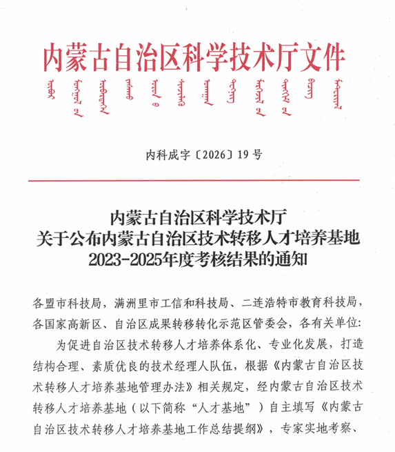 4月15日,内蒙古自治区科学技术厅公布《内蒙古自治区技术转移人才培养基地2023—2025年度考核结果》,bat365官网自治区技术转移人才培养基地顺利通过周期考核,获评合格等次,其在技术转移人才培养、科技成果转化服务等方面的成效与规范运行水平得到肯定。