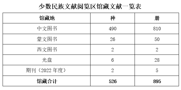 少数民族文献阅览区新面貌迎接新学期。阅览区建立初期开设在图书馆二楼208室,现搬迁到原址对面的201室。馆藏文献特色不变,文献数量正在逐年增加。