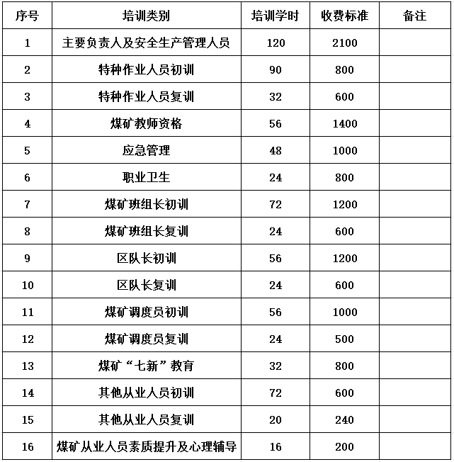 为进一步规范煤矿安全生产培训,根据《内蒙古自治区发展和改革委员会关于核定煤矿安全培训收费标准有关问题的函(内发改费函[2017]132号)》等文件精神,根据企业需求,自愿报名参加的原则,面向煤矿企业开设煤矿安全生产培训,收费标准公示如下: