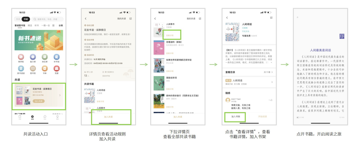本次活动依托掌阅精选线上书城开展,读者在活动开始后,采用“掌阅精选APP”,从“艺读人生:让艺术融入生活”活动专区,参与共读活动。(详见图书馆公众号推文:“艺读人生 | 掌阅精选2024妇女节共读活动正式开启”)