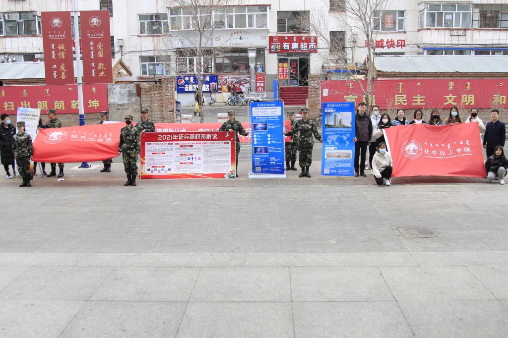 为认真宣传、落实2021年全国高校大学生入伍预征工作政策,帮助广大毕业生、在校生了解掌握应征入伍的相关政策,加强宣传力度,3月23日,化学化工学院在餐饮中心前组织开展了“入伍预征宣传暨政策咨询”活动。学院党总支副书记刘朋、团学办主任张一帆、团总支书记孟庆永及学校民兵应急营战士、学院学生会成员参加宣传活动。