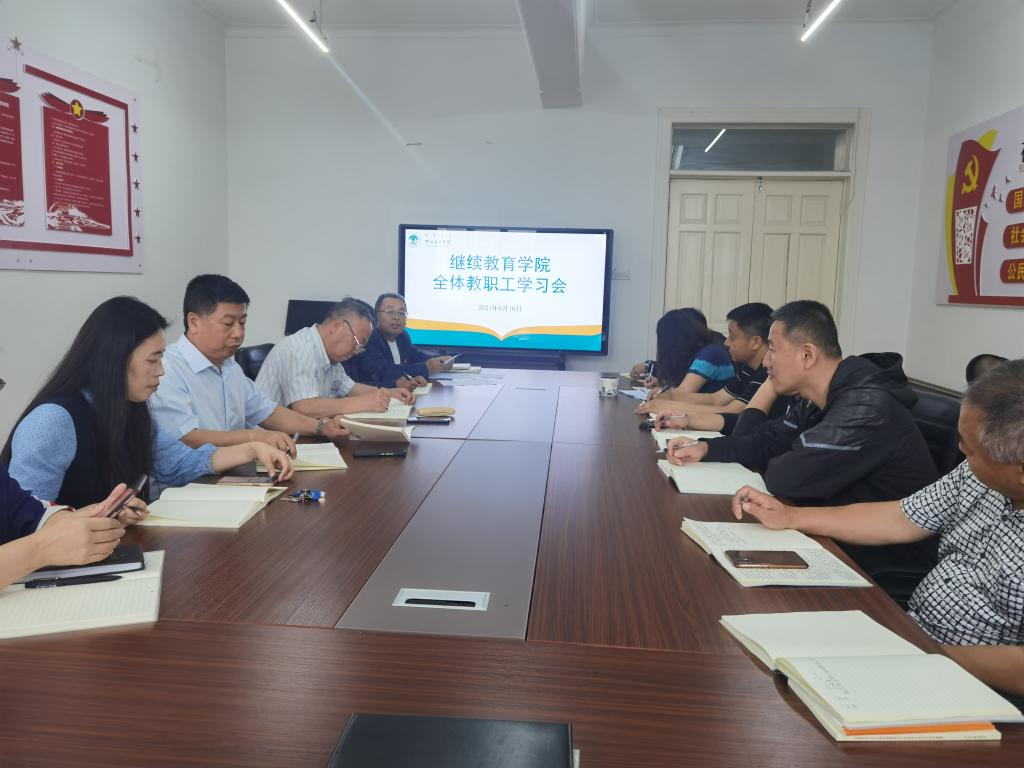 6月16日,继续教育学院组织召开全体教职工学习会,由何平书记领学。