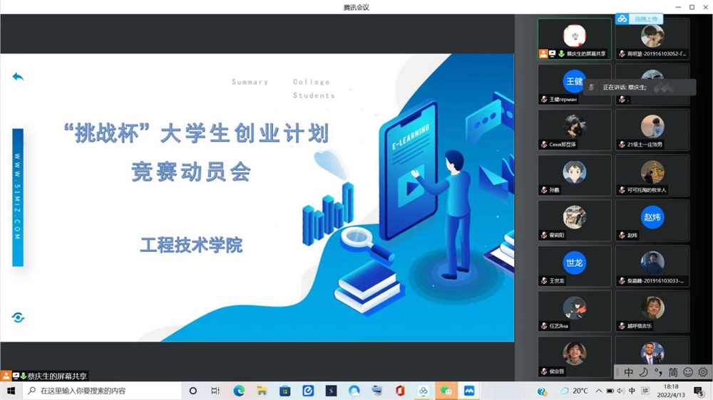 为深入贯彻落实习近平总书记给给第三届中国“互联网+”大学生创新创业大赛“青年红色筑梦之旅”大学生回信重要精神,加快培养创新创业型人才,4月13日下午,工程技术学院通过线上会议的形式举行了“互联网+”大学生创新创业大赛和“挑战杯”大学生创业计划竞赛培训暨动员大会。各年级班长,团支书,学委参加会议。工程技术学院团总支书记蔡庆生老师主持会议。