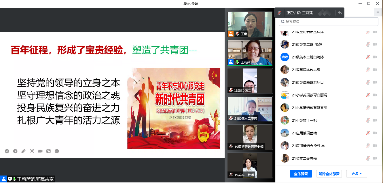 为深入领会习近平总书记在庆祝中国共产主义青年团成立100周年大会上重要讲话的重大意义和深刻内涵,5月27日,外国语学院邀请北京青年政治学院王莉萍教授为外国语学院师生带来“青春心向党 百年再启航”主题线上讲座。外国语学院入党积极分子、学生会全体成员130余人参加了讲座,讲座由外国语学院团总支书记王巍主持。