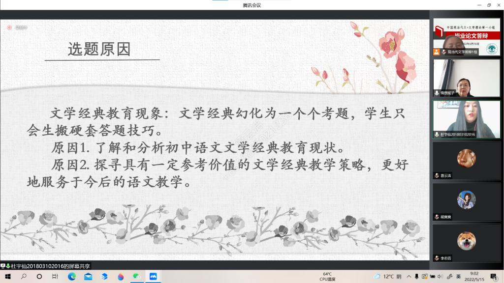 根据《bat365中文官方网站本科毕业生论文〈设计〉管理规定》、《文学院2022届毕业生毕业论文答辩工作安排》及疫情防控的相关要求,5月16日至5月27日,文学院有序开展了线上论文答辩工作。