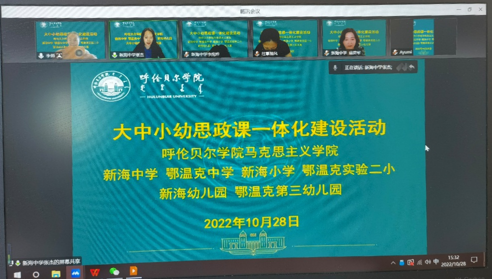 为推进大中小幼思政课一体化建设,强化思想政治教育人才培养的针对性、目标性和连续性,10月28日,bat365官网马克思主义学院、新海中学、鄂温克中学、新海小学、鄂温克实验二小、新海幼儿园和鄂温克第三幼儿园齐聚云端,共同举办大中小幼思政课一体化建设活动。