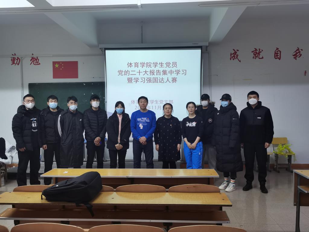 为深入学习宣传贯彻党的二十大精神,进一步加强学生党员理论学习,提高全体学生党员政治理论素养,11月3日上午,体育学院学生党支部在体育馆二楼多媒体教室开展了“学习二十大永远跟党走奋进新时代”为主题的学生党员集中学习党的二十大报告活动暨“学习强国”达人赛。活动由学生党支部书记卜祥云主持,学院党总支书记李伟艳,副书记胡日查,社会体育指导与管理系系主任李嘉麟,学院大三、大四两个年级共45名学生党员参加了此次活动。