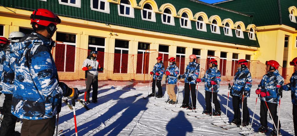 滑雪课因授课学生较多,分5批陆续进行。本次滑雪课程由4名教师带领2020级4个教学班77名学生进行为期10天的单板和双板两个项目的学习。学生从滑雪服套装和头盔的穿戴、专项的准备活动、滑雪技能分阶段的教学进行学习。学生精神状态饱满、上课积极性高涨,教学效果良好。