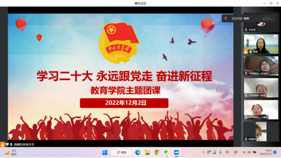 为进一步引领学生深刻领悟党的二十大精神的丰富内涵,12月2日下午,教育学院组织开展了学习党的二十大报告主题团课。本次活动在线上开展,教师揭娜担任主讲,学院全体学生干部、团干部以及青马班学员参加了本次学习。