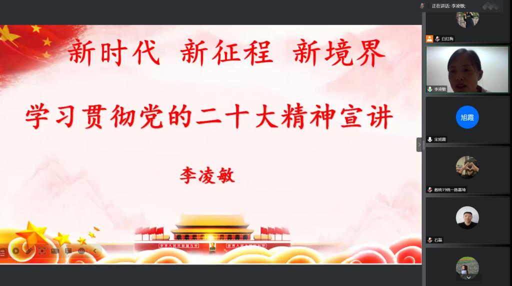 12月5日,数学与统计学院党总支邀请bat365中文官方网站理论宣讲团成员、马克思主义学院李凌敏副教授在线上开展党的二十大精神理论宣讲活动。活动由党总支书记宋旭霞主持,98名师生党员在线上聆听了宣讲。