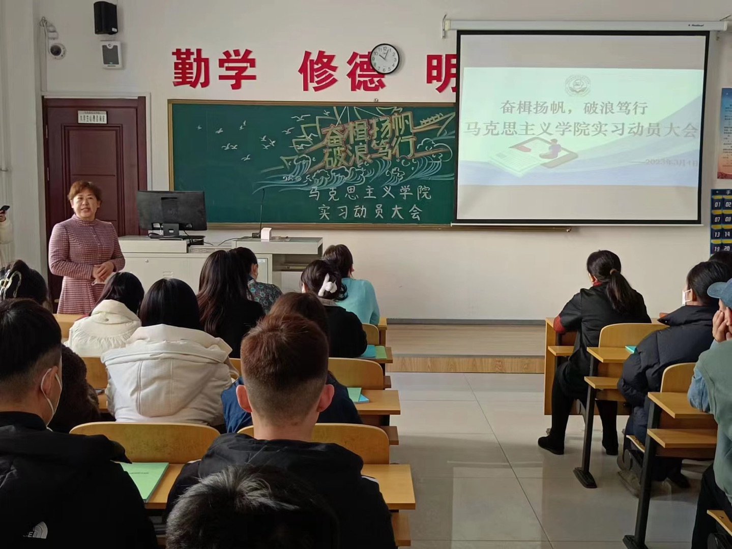 为扎实做好2023届毕业生教育实习工作,引导学生进一步明确实习的目的和意义,推动学生实习工作顺利开展。3月4日上午,马克思主义学院在崇文楼B124教室召开2023届毕业生实习动员大会。学院班子成员、相关环节干部、辅导员及2023届全体毕业生参加,会议由实习实训中心主任吴娇主持。